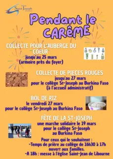 Durant le carême 2026 : collecte pour l'Auberge du cœur de produits d’hygiène, de première nécessité et de produits pour bébé, collecte de pièces rouges, bol de riz, fête de la Saint-Joseph.