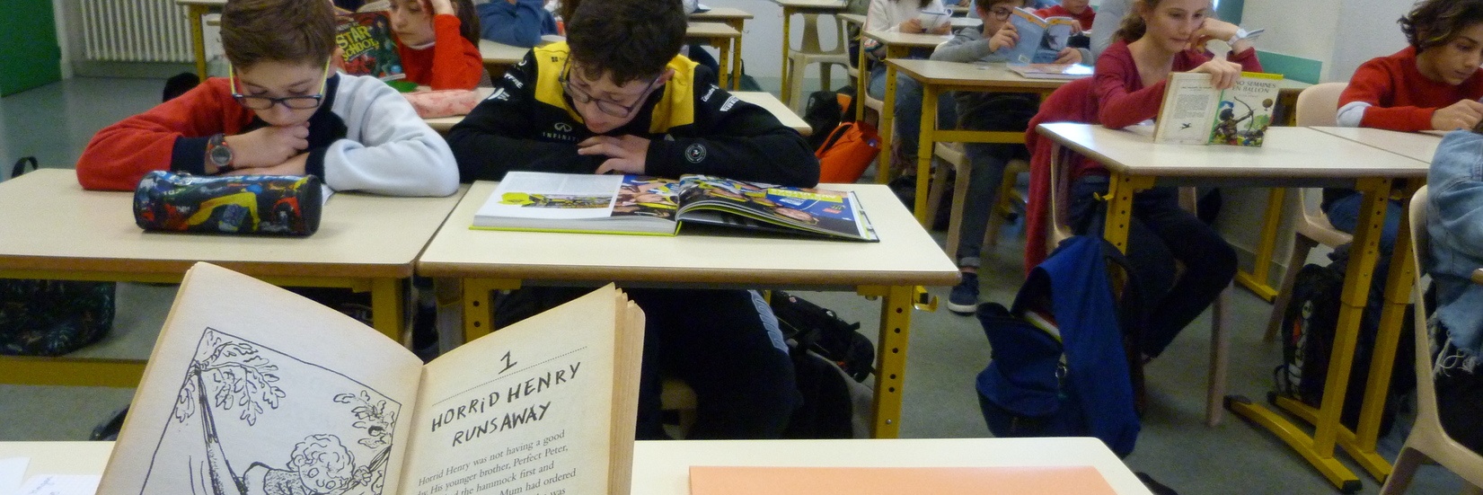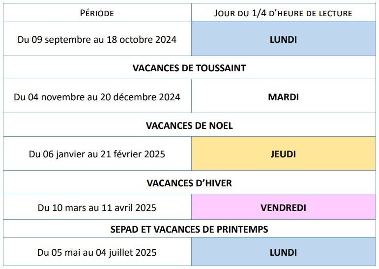 - Un quart d'heure de lecture personnelle par semaine est proposé selon un calendrier communiqué aux élèves,