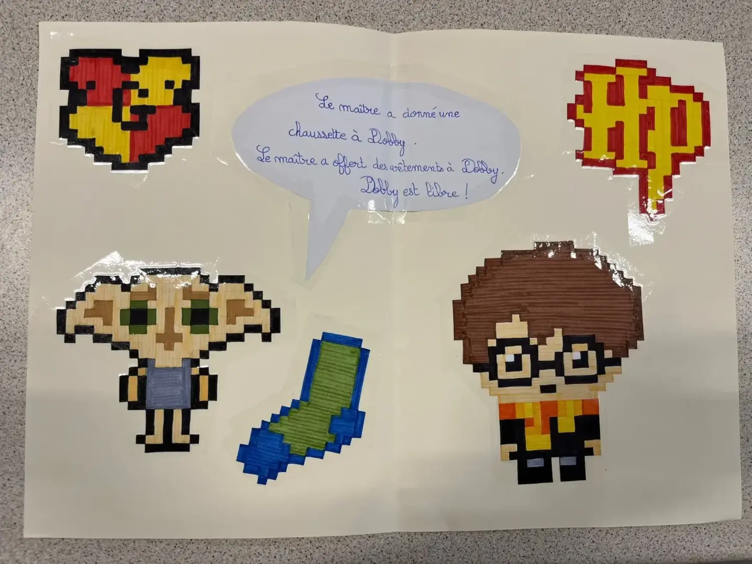 Les élèves de 6e4 ont déposé leurs œuvres et réalisations à la librairie Madison à Libourne dans le cadre de la nuit des livres Harry Potter du 5 au 7 février 2026 en partenariat avec Gallimard. Un élève de la classe remportera à l’issue des votes un livre offert par la librairie Madison à Libourne et Gallimard : le chemin de traverse en version pop up.